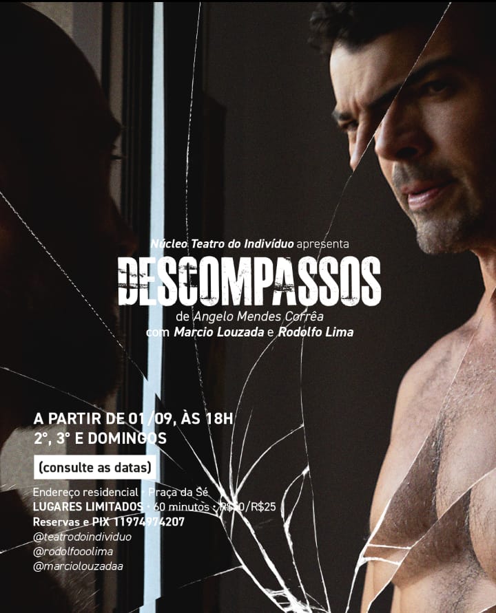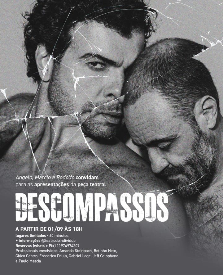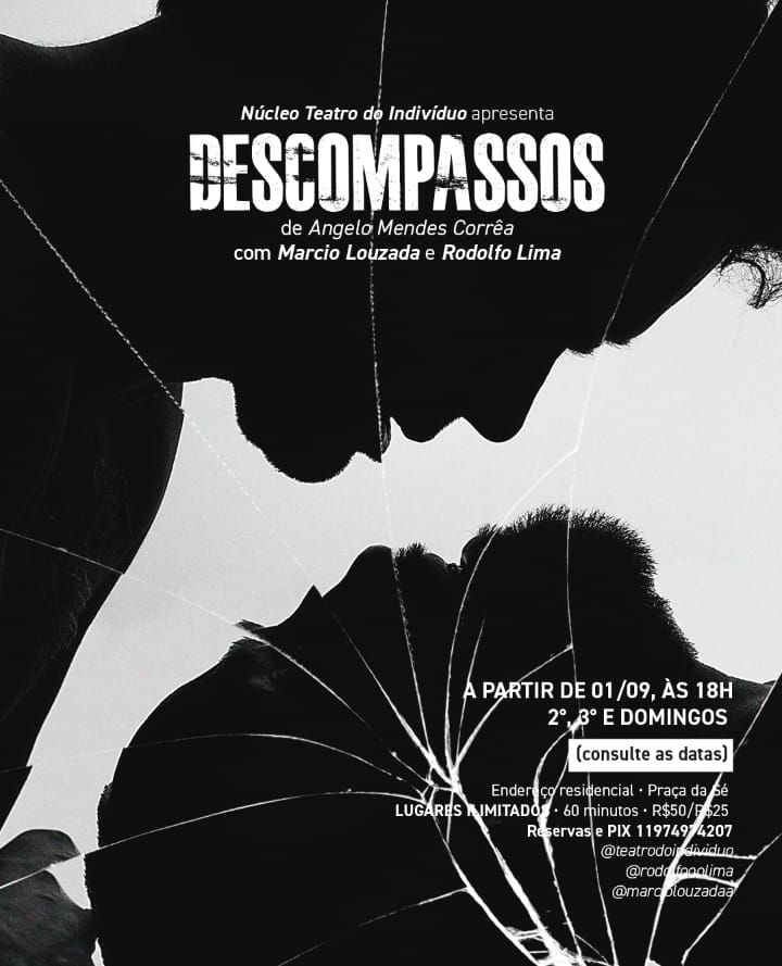 No dia 1º de setembro, às 18h, estreia DESCOMPASSOS, nova criação do Núcleo Teatro do Indivíduo, escrita por Angelo Mendes Corrêa e protagonizada por Marcio Louzada e Rodolfo Lima. Diferente de uma sala de teatro convencional, o público será convidado a entrar em uma quitinete, nos arredores da Praça da Sé, para testemunhar – quase como intrusos íntimos – o embate entre Marcos (Rodolfo) e Felipe (Marcio), casal que, após dez anos de vida juntos, se vê diante de destinos desencontrados.